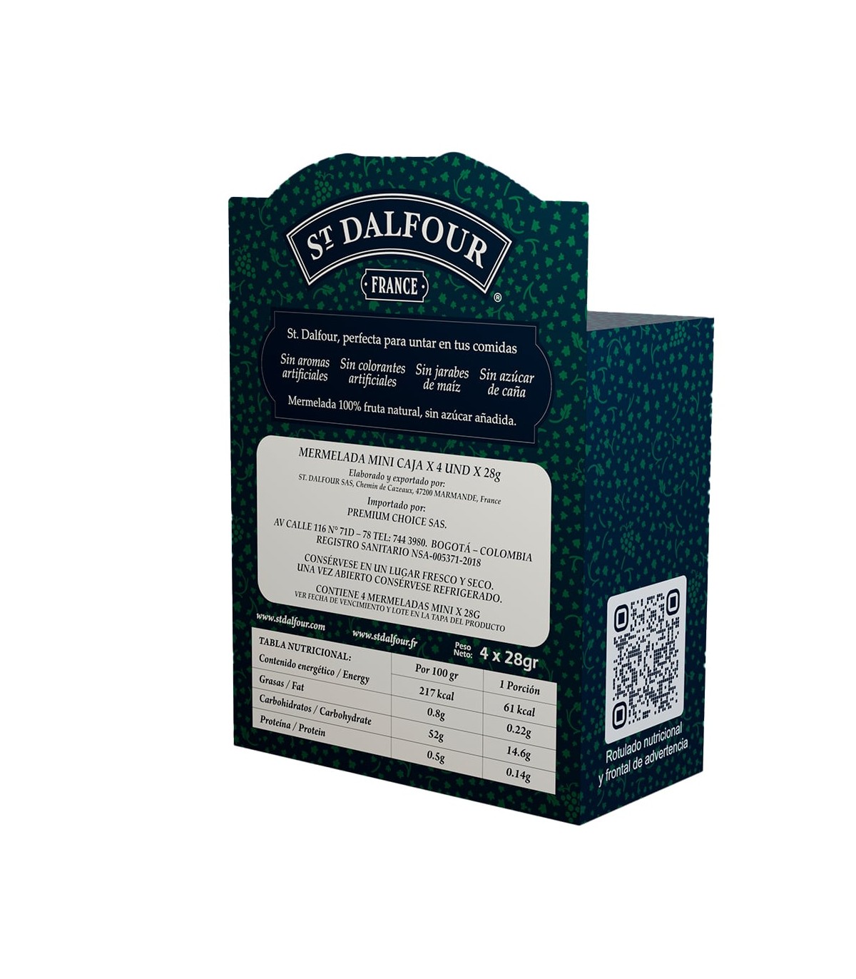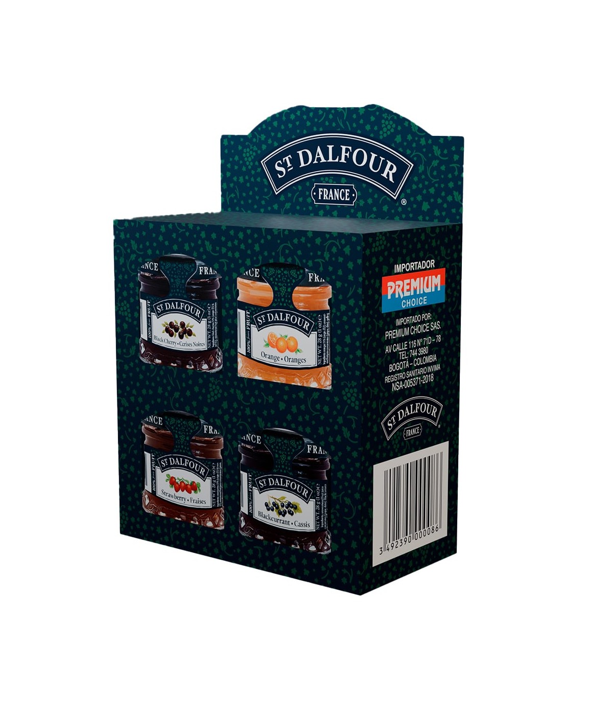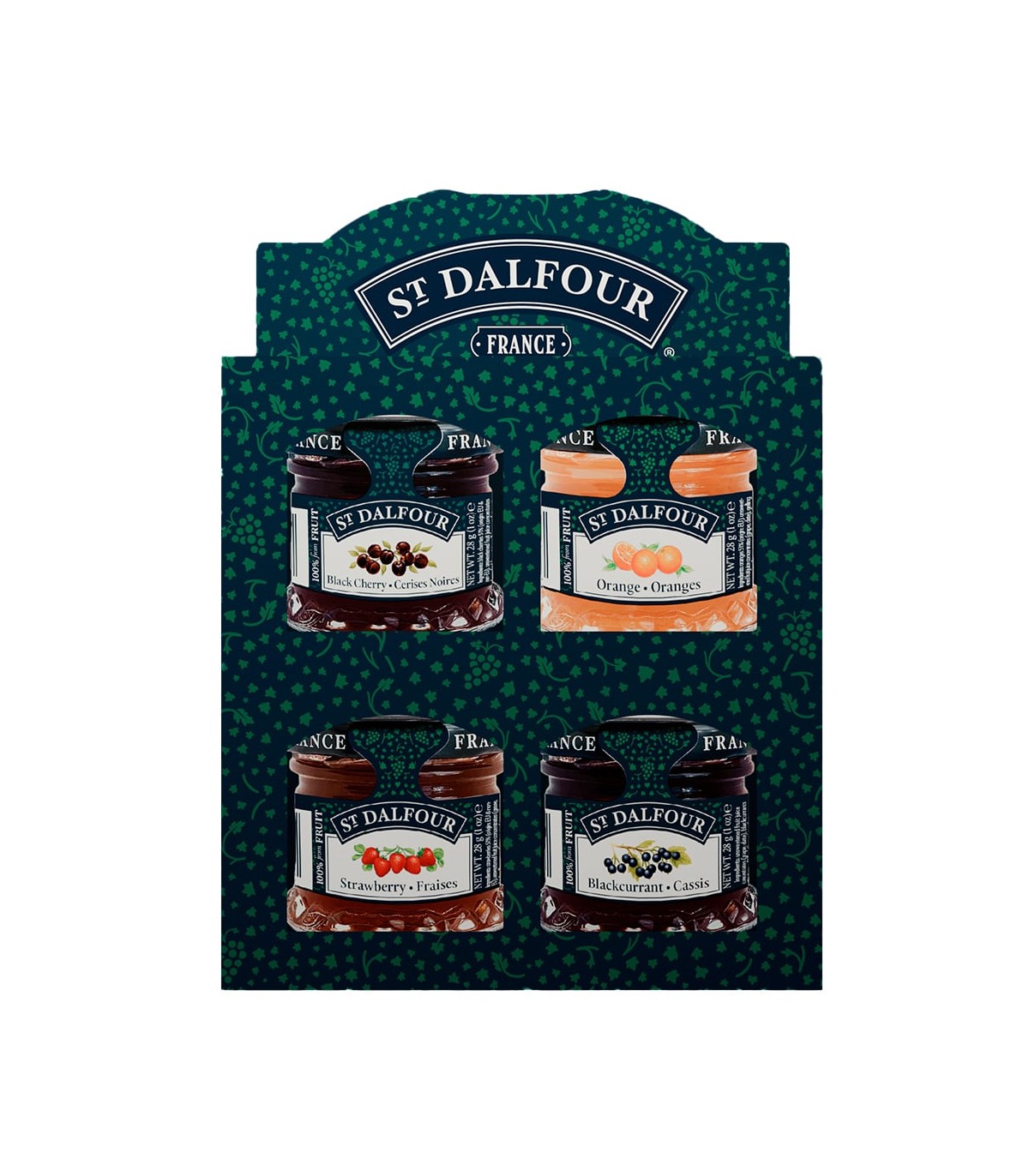 Rica en frutas y 100% naturales, ST DALFOUR se caracteriza por la presencia de las piezas de frutas. Los azúcares naturales de la fruta realzan el sabor y su alto contenido de fructosa ayuda a mantener un sabor dulce a pesar de la baja concentracion de azucar. Los azúcares naturales de la fruta contribuyen a una reducción del indice glicémico. Nuestros expertos seleccionan cuidadosamente los mejores frutos para lograr un producto de alta calidad. Las frutas son cocinadas lentamente a baja temperatura en el jugo de fruta concentrado antes de ser envasado en frascos de vidrio, mediante un sistema de vacío encapsulado. Este proceso conserva la calidad del sabor, rico y afrutado del producto final. Estrictos controles de inspección y de calidad son utilizados a lo largo de todo el proceso de fabricación. La gama cuenta con 19 variedades: Albaricoque, Castana, Cereza Negra, Grosella negra, Mora, Arandanos silvestres, Cranberry / Arándano, Cuatro frutos rojos, Fresa, Frambuesa, Frambuesa / Granada, Ciruela amarilla, Paraguaya, Naranja, Naranja / Jengibre, Figura real, Piña y Mango, Pera y Kumquat (Naranja China). ST DALFOUR ha seleccionado miel "Orange Blossom" y miel "Acacia" para enriquecer su oferta de desayuno.